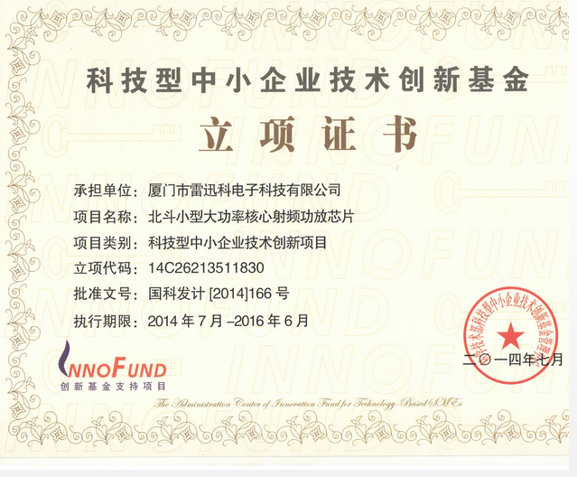 北斗芯片獲得了國家科技型中小企業(yè)技術(shù)創(chuàng)新項目,立項代碼:14C26213511830,批準文號:國科發(fā)計[2014]166號。